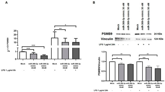 LPS is a potent inducer of immune response and has been demonstrated to augment the expression of immunoproteasome subunits in RAW264.7 [14,32]. Therefore, we examined whether the increased expression of miR-369-3p was able to reduce Psmb9 mRNA also after LPS stimulation. We found that, after LPS stimulation, in mock conditions Psmb9 mRNA expression was significantly increased; however, raising the amount of intracellular miR-369-3p to both 30 nM and 50 nM concentrations significantly decreased the mRNA expression of Psmb9 (p < 0.05; Figure 2A).