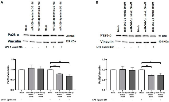 PA28 is a regulatory complex consisting of the PA28α and PA28β subunits, which form a cap that interacts with the 20s core complex through external α-rings. PA28 regulates the catalytic activities of iP subunits and plays a key role in the degradation of damaged proteins and in processing the antigenic peptides for presentation to the MHC-I [13]. Consequently, we investigated whether the PA28 subunits were influenced by transfection with miR-369-3p mimic. As shown from protein expression analysis, in basal conditions, neither subunit underwent any variation. The activation of the immune response via TLR signalling led to an increase in PA28 subunit expression, so we investigated the expression of PA28α and PA28β proteins after stimulation with LPS. Our data showed that the expression of these two subunits increased after LPS stimulation as compared to both mock unstimulated and mock LPS-stimulated conditions. Even then, the transfection with miR-369-3p mimic significantly reduced the expression of PA28α and PA28β (p < 0.05; Figure 4A,B). These results suggest that the modulation of the iP catalytic core subunits by miR-369-3p could indirectly influence the recruitment of the PA28 complex.