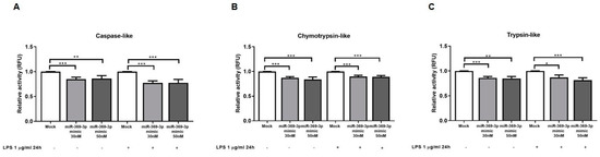 Since the stimulation with LPS of macrophages has been reported to induce the formation of immunoproteasomes and to trigger the enzymatic activities of LMP subunits [14], we likewise examined the immunoproteasome activities after transfection with miR-369-3p in LPS-stimulated RAW264.7 cells. Additionally, in this case, transfection with miR-369-3p mimic had a positive effect on RAW264.7 LPS-stimulated cells, significantly reducing the caspase-like, chymotrypsin-like and trypsin-like activities (p < 0.05, Figure 5A–C).