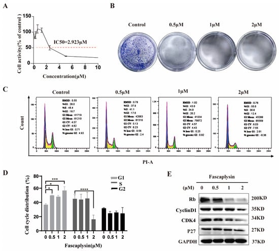 Fascaplysin arrested the cell cycle of A549 cells by regulating cycle-related proteins. (A) Cell viability was measured by CCK-8 assay after treatment of A549 cells with different doses of fascaplysin for 24 h. (B) Representative images of A549 cell colony formation after treatment with fascaplysin. (C,D) Representative results of cell cycle and quantitative analysis. Data are presented as mean ± SD of three independent experiments compared with control. * p < 0.05, *** p < 0.001, and **** p < 0.0001. (E) We examined the expression of cell cycle-related proteins by Western blotting after treating A549 cells with fascaplysin (0, 0.5, 1, and 2 μM) for 3 h.