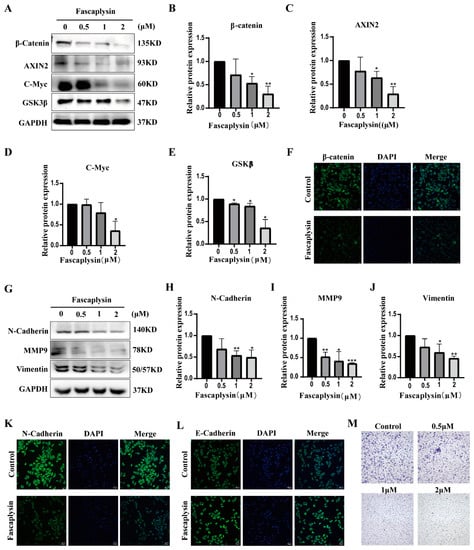 Meanwhile, epithelial–mesenchymal transition (EMT) is considered to be closely associated with tumor progression and metastasis []. Therefore, we investigated whether fascaplysin inhibits cell migration by reversing the EMT phenotype. We examined the expression of EMT-related proteins in A549 cells and found that fascaplysin treatment significantly downregulated protein levels of the intercellular markers N-cadherin, vimentin, and MMP9 (Figure 2G–J). Immunofluorescence assays showed decreased N-cadherin expression and increased E-cadherin expression after fascaplysin treatment (Figure 2K,L). The effect of fascaplysin on A549 cell migration was further confirmed by a transwell assay. The results showed that fascaplysin treatment significantly inhibited A549 cell migration (Figure 2M). In summary, fascaplysin inhibited the migration of A549 cells by regulating the Wnt/β-catenin signaling pathway and reversing the EMT phenotype.