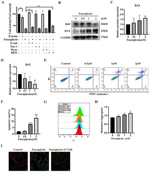 To determine whether fascaplysin could induce apoptosis in A549 cells, we used flow cytometry after double staining with Annexin V-FITC and PI. The results showed that the apoptosis rate of A549 cells increased with an increase in fascaplysin concentrations (Figure 3E,F). Studies have reported that Bcl2 family members play an important role in apoptosis by regulating mitochondrial membrane permeability []. Bcl2 is an inhibitor of apoptosis proteins and BAX is an apoptosis-promoting protein []. We examined the expression of Bcl2 and BAX proteins by Western blotting, and the results showed that the expression of Bcl2 tended to decrease, and BAX tended to be significantly upregulated (Figure 3B–D). Apoptosis is a process of programmed cell death, and mitochondrial apoptosis-inducing channels are early markers of apoptosis development []. There is a difference in the voltage across the mitochondrial membrane, called the mitochondrial membrane potential (MMP or Δψ) []. Significant loss of ΔΨm causes energy depletion and cell death []. We examined the effect of fascaplysin on the mitochondrial membrane potential in A549 cells using a JC-1 probe. The results showed that the mitochondrial membrane potential of A549 cells decreased significantly after fascaplysin treatment, and this decrease in mitochondrial membrane potential was attenuated after fascaplysin co-treatment with Z-VAD (Figure 3G–I). In summary, fascaplysin induced apoptosis and caused a decrease in the mitochondrial membrane potential of A549 cells.