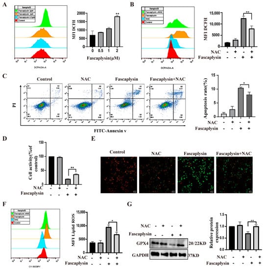 Many studies have shown that oxidative stress (ROS) can lead to apoptosis []. ROS are reactive oxygen species that can activate mitochondria-dependent apoptosis []. We investigated whether fascaplysin-induced apoptosis in A549 cells resulted from elevated ROS. We detected ROS by flow cytometry. The results showed that fascaplysin dose-dependently increased intracellular ROS in A549 cells (Figure 5A). N-acetyl-l-cysteine (NAC), as a conventional antioxidant, scavenges intracellular ROS []. We examined ROS after treating A549 cells with a combination of f and NAC and found that NAC significantly decreased ROS levels and apoptotic rates, whereas NAC itself had no significant effect on intracellular ROS and apoptotic rates in A549 cells (Figure 5B,C). Next, cell viability was measured by CCK8 assay, and the results were consistent with the above (Figure 5D). The above results suggest that the accumulation of intracellular ROS has an important effect on fascaplysin-induced apoptosis in A549 cells. To further understand the mechanism of ROS in fascaplysin-induced apoptosis in A549 cells, we investigated the effect of ROS on mitochondrial membrane potential in A549 cells. After treatment with NAC, ROS levels decreased and MMP loss was significantly alleviated (Figure 5E). These findings suggested that ROS mediated fascaplysin-induced apoptosis. We also tested the effect of ROS on ferroptosis. Compared with A549 cells treated with fascaplysin alone, the level of lipid reactive oxygen species (ROS) decreased and expression of GPX4 protein increased when fascaplysin and NAC were treated together. These results indicated that ROS also played an important role in fascaplysin-induced ferroptosis (Figure 5F,G).