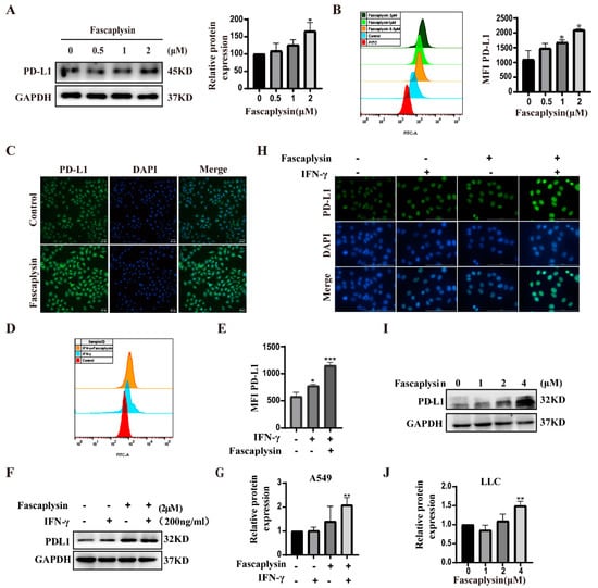 Fascaplysin promoted PD-L1 expression in NSCLC cells. (A) PD-L1 protein expression was detected by Western blotting. (B) After treatment of A549 cells with the PD-L1 kit, the fluorescence intensity of PD-L1 was analyzed by flow cytometry. The histogram is a quantification of the fluorescence intensity of PD-L1. (C) Immunofluorescence showing the level of PD-L1 protein in A549 cells. (D,E) A549 cells were treated with IFN-γ (200 ng/mL) and fascaplysin (2 μM) for 3 h and PD-L1 fluorescence intensity was detected by flow cytometry using a PD-L1 kit. Histograms show quantitation of PD-L1 fluorescence intensity. (F,G) A549 cells were treated with fascaplysin and IFN-γ, alone or in combination, and PD-L1 expression was examined by Western blotting. (H) LLC cells treated with fascaplysin (4 μM) and IFN-γ (200 ng/mL), alone or in combination, were examined for PD-L1 expression by immunofluorescence. (I,J) LLC cells were treated with fascaplysin (0, 1, 2, 4 μM) at various concentrations for 3 h to detect PD-L1 expression by Western blotting. Analysis results represent mean ± SD, * p < 0.05, ** p < 0.01, *** p < 0.001.