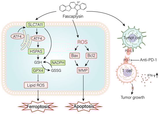 The mechanism of fascaplysin inhibiting the growth of NSCLC in vitro and in vivo. In vitro, fascaplysin induced apoptosis by promoting the elevation of ROS. It induced ferroptosis by modulating the GPX4 signaling pathway and provoked ER stress. In vivo, fascaplysin improved the sensitivity of anti-PD-1 immunotherapy, which in turn inhibited tumor growth.