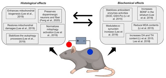 - Li, X.; Lu, C.; Wei, Y.; Hu, R.; Wang, Y.; Li, K. Transcranial Direct Current Stimulation Ameliorates Behavioral Deficits and Reduces Oxidative Stress in 1-Methyl-4-Phenyl-1,2,3,6-Tetrahydropyridine-Induced Mouse Model of Parkinson’s Disease. Neuromodul. Technol. Neural Interface 2015, 18, 442–447. [Google Scholar] [CrossRef]