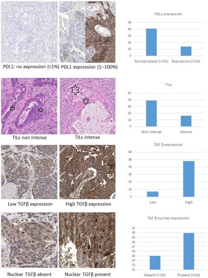 Here, we aimed to evaluate the association of clinicopathologic characteristics and the prognostic value of PDL-1 expression and TILs, and explored the immune microenvironment by assessing their relationship, since they have been suggested as clinically applicable predictive biomarkers in surgically resectable NSCLC. Furthermore, we studied TGF-β expression and proposed a more simple and efficient way for its assessment (nuclear staining), since this molecular target has been outlined as a potential prognostic biomarker that may open a new line of research pointed towards TGF-β inhibitor therapies in NSCLC, in combination with ICIs in those patients with a worse prognosis.
