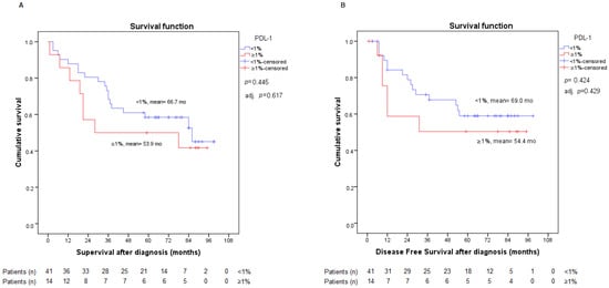 Analysis of overall survival (A) and disease-free survival (B) according to PD-L1 expression <1% or ≥1%. Adj. p: p-value from Cox regression model adjusted by stage.