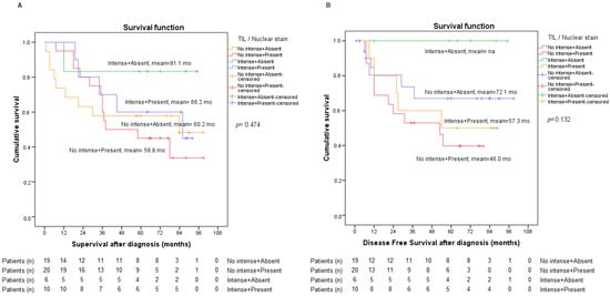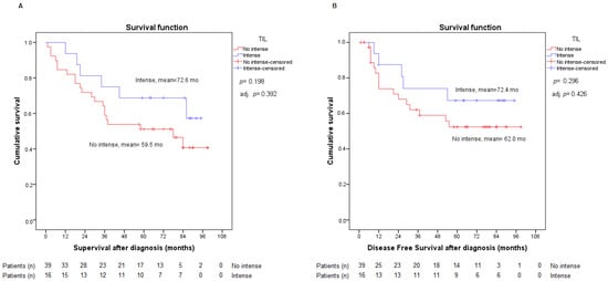 As previously described, the presence of TILs has been dichotomously assessed (intense, non-intense). In our study, 39 patients presented intense TILs, whereas 16 had non-intense TILs. Our analysis revealed very moderate indications of significance, with a better prognosis in terms of OS with intense TILs (Figure 3). There were no statistically significant differences in DFS between the two groups. Adjusting these data with the staging variable also generated no statistical changes. Adjustments for sex and age, and sex and stage, did not modify our findings either. Therefore, the TILs variable did not manifest as a risk factor for OS and DFS, adjusted for sex, age, and stage.