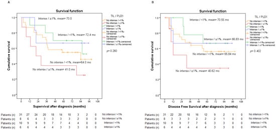 Analysis of overall survival (A) and disease-free survival (B) according to PD-L1 expression <1% or ≥ 1% and intense or non-intense TIL.