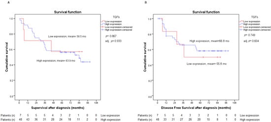Analysis of overall survival (A) and disease-free survival (B) according to low or high TGF-β expression. Adj. p: p-value from Cox regression model adjusted by stage.