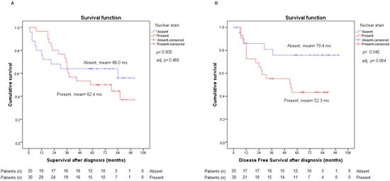 Analysis of overall survival (A) and disease-free survival (B) according to absent or present TGF-β nuclear staining. Adj. p: p-value from Cox regression model adjusted by stage.