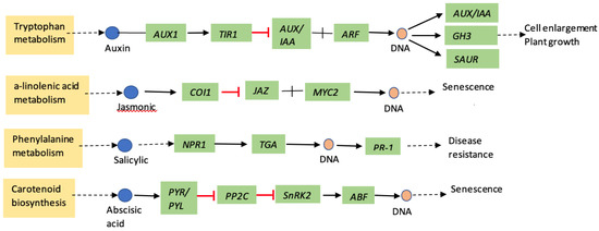 Two genotypes, resistant (Tx2783) and susceptible (BTx623) to SCA, were selected for a comparative analysis in the experiments. In Table 1, Tx2783 showed a significantly lower aphid population and low damage ratings in comparison to BTx623, which supports the antibiosis and tolerance mechanisms of resistance. Previous studies revealed that Tx2783 carries the resistance to SCA through tolerance and/or antibiosis mechanisms [29,30]. The plant genotypes that carry more than one category of resistance are considered better because tolerance traits limit the yield loss and antibiosis helps to control the population of SCA [29]. Plant resistance is mediated by hormones through various defense signaling pathways [31], which is the initial step in the plant-aphid interaction, leading to activation of resistance genes in plants. The major phytohormones such as JA, SA, ET, ABA, and GA are important players in defense signaling pathways. These hormones can act individually or together, with antagonistic or synergistic interactions, in the plant signal network [32].
