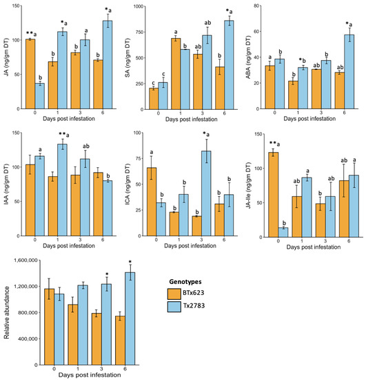 Constitutive levels of seven phytohormones in resistant (Tx2783) and susceptible (BTx623) genotypes during SCA infestation at different time points. The asterisk (*) at the top of each bar represents the significant difference between the genotype at same time points (* p < 0.05, ** p < 0.01; t-test). The letters at the top of each bar represent significant difference between time points within a same genotype (p < 0.05; one-way ANOVA). (Error bars represent the mean ± SE (n = 3).