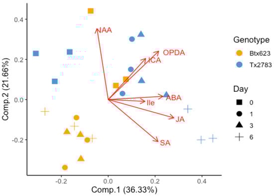 Principal component analysis (PCA) was performed to see the impact of SCA infestation on the phytohormone levels at different time points. In PCA analysis (Figure 4), the component 1 and 2 explained 58% of variability. The first principal component accounting for 36.33% of the variance indicates a strong differential response between the two genotypes and the same for control vs. aphid-infested samples at the hormonal level. Similarly, the second component accounting for 21.66% of the variance resolves the differential response between the four time points. Five clusters were formed in the PCA plot which consisted of all aphid-infested BTx623 (left-down), control BTx623 (right-top), control Tx2783 (left-top), 1- and 3-dpi Tx2783 (right-top), and 6-dpi Tx2783 (right-down). The clustering of similar samples based on the treatments highlights the reproducibility of the experiments. In addition, the PCA results followed and were grouped based on the genotypes and treatments, which indicates that the metabolic and genetic diversity between genotypes is independent of the host response to aphid feeding [28]. The loading plot (red line) indicates that Tx2783 produced higher levels of JA, Ile, ABA, SA, OPDA, and ICA during sorghum–SCA interaction in comparison to BTx623. It also indicates that JA, Ile, and ABA are positively correlated and present in relatively higher levels at 3- and 6-dpi in Tx2783. Similarly, ICA and OPDA are positively correlated and are present in relatively higher amounts at 1- and 3-dpi in Tx2783. In contrast, BTx623 expressed a relatively lower amount of these phytohormones in plants during SCA infestation. The PCA plot also indicated the negative correlation between SA and IAA. These results indicate that during aphid infestation, Tx2783 (resistant) produced relatively higher amounts of phytohormones and the activities of these phytohormones showed an apparent correlation between JA–ABA–Ile and OPDA–ICA.