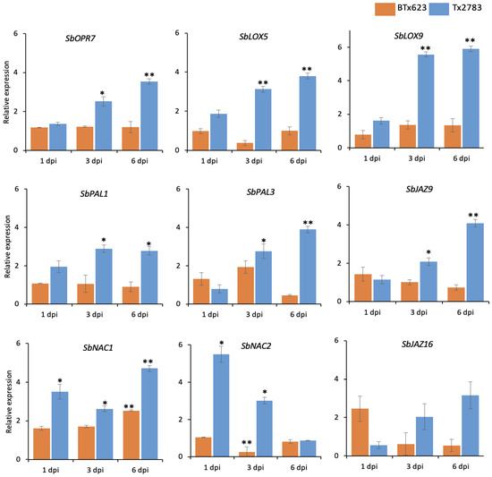 To further support the role of phytohormones in SCA resistance, relative expression of JA-, ABA-, and SA-related marker genes were assessed using the RT-PCR method. The expression pattern of these transcripts were evaluated in both genotypes (Tx2783 and BTx623) after SCA infestation. The expression of SbLOX9 was significantly higher in Tx2783, around six-fold at 3- and 6-dpi, in comparison to BTx623 (Figure 5). Similarly, SbLOX9 and SbOPR7 showed around three- and four-fold increases in Tx2783 at 3- and 6-dpi, respectively. For ABA-related transcripts, NAC (NAM, ATAF1–2, and CUC2) domain proteins, SbNAC1 and SbNAC2, were analyzed in this study. The relative expression of SbNAC1 in Tx2783 was significantly higher at all time points in comparison to the BTx623 with the highest expression level around five-fold at 6-dpi. Similarly, SbNAC2 in Tx2783 showed around five-fold and three-fold increases at 1- and 3-dpi, respectively. For SA-related transcripts, two phenylalanine ammonia-lyase (PAL) genes, SbPAL1 and SbPAL2, were evaluated in this study. Both SbPAL1 and SbPAL2 showed significant upregulation in Tx2783 at 3- and 6-dpi in comparison to BTx623. To investigate the crosstalk between the phytohormones, two Jasmonate ZIM-domain (JAZ) genes, SbJAZ9 and SbJAZ16, which were previously identified for JA–ABA crosstalk [11], were also evaluated here. It was found that SbJAZ9 had two-fold and four-fold increases in Tx2783 at 3- and 6-dpi, respectively. Overall, upregulation of the above mentioned phytohormone genes was documented in the resistant line during sugarcane aphid infestation.