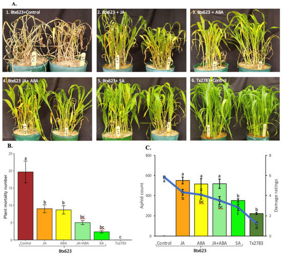 To further confirm the role of SA, JA, and ABA in response to the SCA infestation, a small population test was performed. Around 20–25 plants of two genotypes (BTx623 and Tx2783) were planted in a pot. The 2–3 leaf stage (8–10 days) seedlings were sprayed with 600 µM SA [57], 100 µM MeJA [58], 50 µM ABA [59], and sterile distilled water (ddH2O, control) to each pot separately. The phytohormones (JA and SA) were mixed separately in distilled water and stirred until dissolved completely and 0.1% of Tween20 was added to each solution. For preparing ABA solution, 39.63 mg of ABA was dissolved in 1ml of ethanol and then diluted in 3 L of distilled water to make a desired concentration (50 uM of ABA). A total of 3 mL of Tween20 (0.1%) was added to this solution and mixed properly. The phytohormones solutions (SA, JA, ABA, and JA + ABA) and control (ddH2O) were sprayed separately to each pot until the plants were soaked completely with the solution. Each phytohormone treatment and control had three replicates. After spraying, the pots were covered with a transparent cylindrical cage with nylon mesh on the top. After 6 h, each sprayed pot was infested with 400 SCA. At 14-dpi, plant mortality rate was recorded from each pot. In addition, aphid numbers and plant damage scores were recorded from four random plants from each pot.