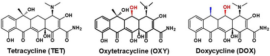 - Chopra, I.; Roberts, M. Tetracycline antibiotics: Mode of action, applications, molecular biology, and epidemiology of bacterial resistance. Microbiol. Mol. Biol. Rev. MMBR 2001, 65, 232–260. [Google Scholar] [CrossRef] [PubMed]