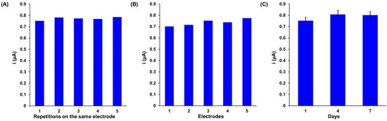The aptasensor based on the ferrocene-labeled ssDNA aptamer was also characterized by determining parameters such as reproducibility, repeatability, and stability over time (Figure 3 and Table 1). Adequate reproducibility and repeatability of the aptasensor proposed were observed, proven by relative standard deviation (RDS) values of 1.7% and 3.9%, respectively (Figure 3A,B and Table 1).