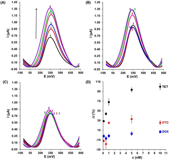 Example of square-wave voltammograms registered for gold electrodes modified with Au-S-Apt-Fc/MCH upon interaction with (A) TET, (B) OTC, and (C) DOX. Black curve (1) before and next curves after 1 h interaction with antibiotics at particular concentrations: 0.1 nM (red, 2), 0.5 nM (blue, 3), 1.0 nM (pink, 4), 5.0 nM (green, 5), and 10.0 nM (violet, 6). (D) Relative intensity of current (ΔI) vs. concentration of (●) TET, (♦) OTC, and (■) DOX for gold electrodes modified with Au-S-Apt-Fc/MCH.
