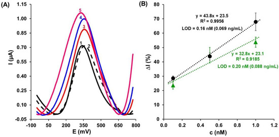 Figure 5B illustrates the relationships between the variation value of the electrochemical signal relative to the blank buffer or cow milk matrix (ΔI, %) and the concentration of TET in the 0.1 to 1.0 nM range registered in the buffer (●) and spiked milk (▲). The limits of detection (LODs) were estimated to be 0.16 nM (0.069 ng/mL) in the buffer and 0.2 nM (0.088 ng/mL) in the cow milk matrix, using the following equation: