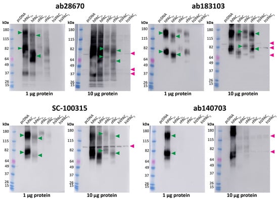 | Specificity * | Specificity | Detected Bands (~kDa) | Bands Consistent with Target a (~kDa) | Bands in pcDNA (~kDa) | ||