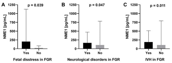 (A) Comparison of serum NME1 concentrations with reference to perinatal fetal distress in fetal growth restriction (FGR), (B) neurological disorders in FGR, and (C) intraventricular hemorrhage (IVH) in FGR newborns.