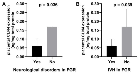 (A) Comparison of placental CLN4 expression with reference to neurological disorders in fetal growth restriction (FGR) and (B) intraventricular hemorrhage (IVH) in FGR newborns.