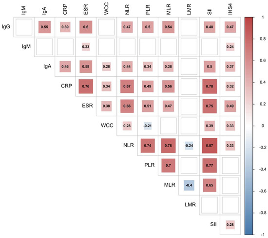 Correlation matrix between immunoglobulin levels, haematological indices of inflammation and disease severity according to IHS4 classification. The square colour depicts Spearman’s rank-order correlation coefficient, with its size and colour intensity indicating the magnitude of the correlation coefficient. Significant correlation coefficients are labelled. Empty cells represent insignificant pairwise correlation between indices. SII—systemic immune-inflammation index.