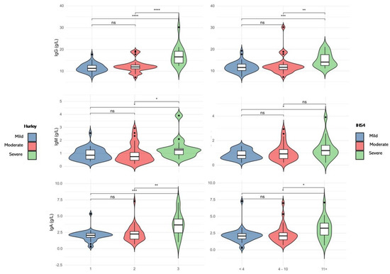 Violin plots illustrating immunoglobulin levels across HS severities as assessed by the Hurley severity score (left panels) and International Hidradenitis Suppurativa Severity Scoring System (IHS4) (right panels) severity staging. The violin plots depict data distribution. The centre line in the box-plot illustrates the median, the box limits indicate the 25th and 75th percentiles and the whiskers extend to 1.5 times the interquartile range from the 25th and 75th percentiles. * p < 0.05, ** p < 0.01, *** p < 0.001, **** p < 0.0001, ns—not significant.