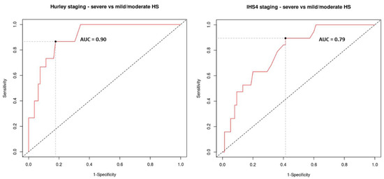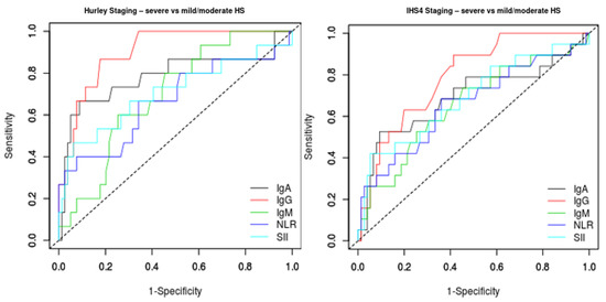 We also explored the sensitivity of the analysis to the exclusion of subjects having moderate disease severity. IgG levels demonstrated a strong discriminatory capacity to distinguish participants with severe from mild disease according to the Hurley staging system (AUC = 0.92, CI 0.856–0.992, p < 0.01) and according to the IHS4 category (AUC = 0.81, CI 0.697–0.917, p < 0.01) (Table 3). When contrasting patients with moderate vs. mild disease according to both Hurley and IHS4 classifications, IgG, M and A levels and inflammatory indices did not exceed significance thresholds.