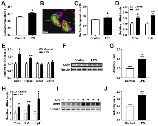 Low-dose LPS induced fever in mice. (A) Rectal temperatures of mice treated with 10 μg/kg LPS for 1.5 h. (B,C) Dorsal interscapular surface imaging and temperature. (D,E) The inflammation-related (D) and thermogenic-related (E) mRNA expression levels in the BAT of mice treated with 10 μg/kg LPS for 4 h (n = 6). (F,G) The UCP1 protein levels in the BAT. (H–J) The TNFα, IL-6, Ucp1 mRNAs (H), and UCP1 protein (I,J) expression levels in primary brown adipocytes treated with or without 0.2 μg/mL LPS. Data are presented as the mean ± SEM. * p < 0.05 vs. controls; ** p < 0.01 vs. controls, as determined by Two-tailed unpaired Student’s t-test.