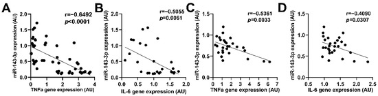 miR-143 was negatively correlated with the expression of inflammatory factors in the BAT. (A,B) Correlation between miR-143 expression and TNFα (A) or IL-6 (B) in the BAT of mice fed HFD for 0, 1, 3, 7, 14, 21 days (n = 48 and 28). (C,D) Correlation between miR-143 expression and TNFα (C) or IL-6 (D) in primary brown adipocytes treated with 0.2 μg/mL LPS for 0, 12, 24, 48 h (n = 28). The correlation between miR-143 and IL-6 or TNFα was analyzed by GraphPad Prism 9.0.