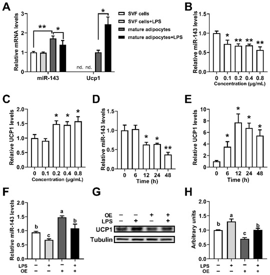 LPS increased UCP1 expression in brown adipocytes while downregulating miR-143. (A) The miR-143 and Ucp1 mRNA expression levels in the isolated SVF cells and mature adipocytes from BAT of mice treated with or without 10 μg/kg LPS (n = 6); nd., not detected. (B,C) The miR-143 and Ucp1 mRNA expression in primary brown adipocytes in response to 24 h treatment with various concentrations of LPS (n = 6). (D,E) Time course of miR-143 and Ucp1 mRNA induction in primary brown adipocytes in response to LPS (0.2 μg/mL) treatment (n = 6). (F–H) The miR-143 expression (G) and UCP1 protein levels (H) in WT and miR-143-overexpressed primary brown adipocytes treated with or without 0.2 μg/mL LPS. Data are presented as the mean ± SEM. * p < 0.05 vs. controls; ** p < 0.01 vs. controls. Different letters above bars represent significant differences, with shared letters representing no significant differences, as determined by a two-tailed unpaired Student’s t-test (A–F) or two-way ANOVA followed by Tukey’s post hoc test (G).
