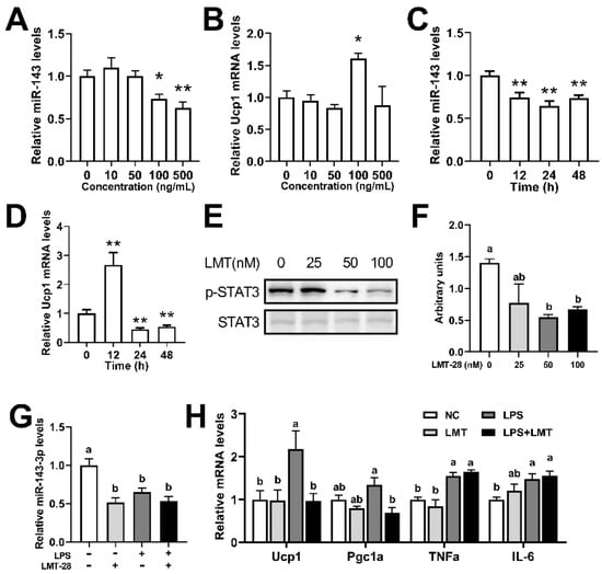 To further determine the relationship of miR-143 and IL-6, we treated brown adipocytes with IL-6 protein and LMT-28 (an IL-6 signaling pathway inhibitor). Results showed that 100 ng/mL and 500 ng/mL IL-6 could significantly reduce the expression of miR-143 and 100 ng/mL IL-6 could significantly increase the expression of Ucp1 mRNA (Figure 4A,B). Different IL-6 treatment duration time could also affect the decline of the miR-143 expression. Noteworthy, we observed significant up-regulation of Ucp1 mRNA expression at 12 h, which significant down-regulation after 24 h (Figure 3D,E), and it may be due to the excessive inflammation. Moreover, 50 nM and 100 nM LMT could significantly reduce the protein level of phosphorylated STAT3 without affecting the protein level of STAT3 (Figure 4E,F). Interestingly, both LMT and LPS could significantly reduce the expression of miR-143, and the results of LPS + LMT were similar to those of LPS or LMT alone (Figure 2G). More importantly, LMT could significantly inhibit the increase of Ucp1 and Pgc1α mRNA levels induced by LPS but did not affect the levels of IL-6 and TNFa mRNA (Figure 2H). The above results indicated that LPS may inhibited the expression of miR-143 through IL-6 signaling pathway, thereby promoting the level of Ucp1 mRNA.