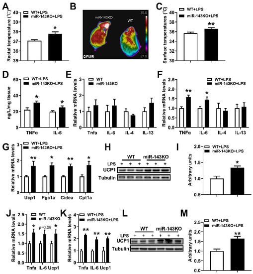 Many proinflammatory cytokines such as TNFα and IL-6 are expressed under the induction of obesity or LPS. Our study found that LPS induced fever as well as the thermogenesis of brown adipocytes and BAT, plus increasing the levels of TNFα and IL-6 mRNA. IL-6 can be considered an important positive regulator of BAT activation [36,37,38], while TNFα plays the opposite role [39]. Recently, it has also been found that some other anti-inflammatory cytokines directly affect brown adipocyte thermogenesis, such as IL-27 [15] and IL-10 [40]. Our recently published data shows that miR-143 is involved in the BAT thermogenesis [28]. TNFα was reported to decrease the expression of miR-143 in differentiated 3T3-L1 adipocytes [29]. Therefore, we further examined the correlation between miR-143 and inflammatory factors. Our data showed that miR-143KO did not affect the inflammation-related mRNA expression in BAT (Figure 5E). However, miR-143 was negatively correlated with TNFα and IL-6 mRNA expression in the BAT and primary brown adipocytes induced by HFD or LPS (Figure 2).