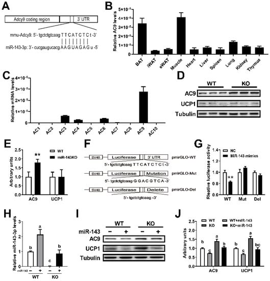 miR-143 targets AC9. (A) The predicted target site for miR-143 in the 3′-UTR of AC9. (B) The tissue distribution of mRNA encoding AC9 (n = 6–8). (C) The type 1 to 10 adenylyl cyclase mRNA expression levels in BAT (n = 6–8). (D,E) The AC9 and UCP1 protein expression levels in the BAT of WT and KO mice fed ND (n = 3). (F) AC9 3′-UTR with fully changed nucleotides in the seed sequence or with a deleted seed sequence disrupts the binding of miR-143. (G) Three 3′-UTR sequences were respectively cloned into the pGL3-Control vector downstream of the luc+ gene, and luciferase assays with the constructed vectors were transfected into differentiated 3T3-L1 cells with negative control (NC) or miR-143 mimic were performed (n = 8–10). (H–J) The miR-143 (H) (n = 4) and AC9 protein (I,J) (n = 3) expression levels in WT or KO brown adipocytes treated with blank or miR-143 expression lentivirus. Data are presented as the mean ± SEM. ** p < 0.01 vs. controls. Different letters above groups represent significant differences, with shared letters representing no significant differences, as determined by a two-tailed unpaired Student’s t-test (E,G) and two-way ANOVA followed by Tukey’s post hoc test (H,J).