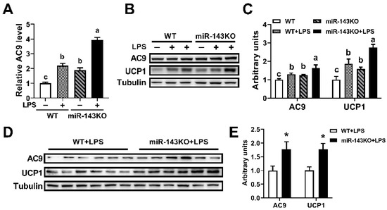 LPS regulates UCP1 expression through the miR-143-AC9 signaling pathway. (A–C) The AC9 mRNAs (A), and AC9, UCP1 protein (B,C) expression levels in WT or miR-143KO primary brown adipocytes treated with or without 0.2 μg/mL LPS. (D,E) The AC9 and UCP1 protein expression levels in mice treated with 10 μg/kg LPS. Data are presented as the mean ± SEM. * p < 0.05 vs. controls. Different letters above groups represent significant differences, with shared letters representing no significant differences, as determined by a two-tailed unpaired Student’s t-test (E) and two-way ANOVA followed by Tukey’s post hoc test (A,C).