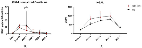 Temperature development at the start of reperfusion by thermographic analysis in the first 80 s showed no significant differences between the groups. Onset temperature was 25.17 °C (SD = 1.87) for the TIB and 25.8 °C (SD = 1.57) for the control group and was achieved approx. 29 min in the control and 40.5 min for the TIB group after the start of anastomosis (Figure 2b). This can be used to explain the lack of significance in the onset temperature. The average length of surgery for kidney transplantation is usually considered to be 35 min; longer surgery times are associated with surgical difficulties or challenges [5,21]. In our study, prolonged operation times >45 min occurred twice in the TIB group and none in the control group. This must therefore be taken into account when interpreting the thermographic results. This can also be considered in comparison to the use of the TBB as a comparative device, likewise reporting a temperature of about 24 °C after 35 min [15]. Semi quantitative histopathological analysis of scores of renal tissue injury shown in Table 1 did not detect any significant differences in the use of TIB and the control group. This is shown by exemplary images of histological sections in PAS staining for the control group and TIB (Figure 5). Similar results were also shown in the use of an intra-abdominal cooling device [22]. In the 2019 study by Longchamp et al., a cooling device in the porcine model of kidney transplantation was also used, achieved by continuous circulation of ethanol and methylene blue at a temperature of 4 °C. [17]. Despite promising results in some data, no clear significance could be shown in the context of tissue injury. Overall, the degree of histological damage in the study shown here is classified as mild to moderate (Table 1). This is also underlined by the results of ELISA analysis (Figure 7a–d). While pi-GST (Figure 7c) as a marker for tubular cell damage shows significant differences as a single index, NGAL, and TNF-alpha did not show any significant between-group differences and their value rather corresponded to moderate renal damage. Results of KIM-1 showed a significant difference on POD1 which could not be fully explained and maybe was caused by the relatively low sample size and high deviation. However, despite the lack of significant differences, the median values of the TIB group were below those of the control group in the majority of investigations.
