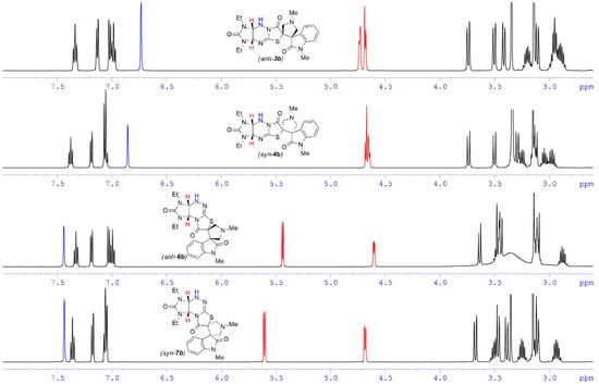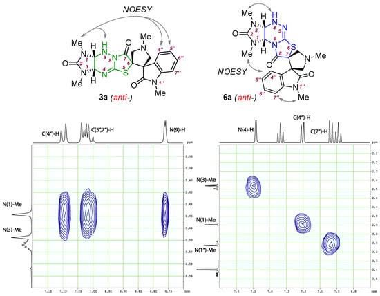 The structures of compounds 3a, 3b, 6a and 7b were also confirmed by NMR data in DMSO solutions using NOESY 2D correlation technique. Hydrogen atoms of alkyl group at the nitrogen atom N(1) and hydrogen atoms H-4″, H-5″ of oxindole fragment in compounds 3 are spatially close. The presence of cross-peaks of these protons in the NOESY spectra is characteristic of the anti-diastereomers 3a, 3b. In the NOESY spectra of anti-diastereomer 6a, correlations between protons of N(1)Me group and H-4″ of oxindole fragment, between protons of N(3)Me and N(4)H groups, as well as between protons H-7″ and N(1′)Me of oxindole fragment were observed. In the NOESY spectrum of syn-diastereomer 7b cross-peaks of NMe group and oxindole fragment protons are absent (see Figure 6 and Supplementary Information).