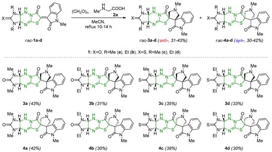 To synthesize target dispirooxindoles we used previously prepared racemic oxindolylideneimidazothiazolotriazines 1a–d [,]. The cycloaddition of azomethine ylide generated from paraformaldehyde and sarcosine 2a to dipolarophiles 1a–d was carried out in acetonitrile under reflux for 10–14 h. According to the NMR spectroscopy data, the reaction proceeded unselectively to afford the mixture of two anti- and syn-diastereomers 3 (3aR*,4’R*,6S*,9aS*-3a,b, 3aR*,4’S*,6R*,9aR*-3c,d) and 4 (3aR*,4’S*,6R*,9aS*-4a,b,3aR*,4’R*,6S*,9aR*-4c,d) in 1:1 ratio (Scheme 1). The mixtures were separated by column chromatography (iPrOH as eluent), and each of isomers 3a–d and 4a–d was isolated individually in the yields of 31–43 and 30–42%, respectively.