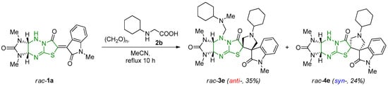 Dipolarophile 1a–d (0.5 mmol), paraformaldehyde (0.060 g, 2.0 mmol) and N-alkylglycine 1a,b (2.0 mmol) were charged in a flask and acetonitrile (40 mL) was added. The resulting suspension was refluxed with stirring for 10–14 h until the red color disappeared. The solvent was then removed under reduced pressure to afford a solid product. This solid was dissolved in isopropyl alcohol (10 mL) and separated via column chromatography using isopropyl alcohol as eluent. Anti-diastereomers 3a–e have a retention factor Rf = 0.20–0.39, syn-diastereomers 4a–e have a retention factor Rf = 0.43–0.60.