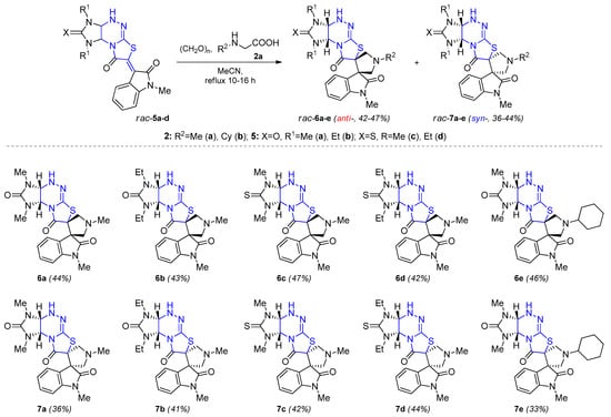 3.3. General Procedure for the Preparation of Dispiro[imidazo[4,5-e]thiazolo[2,3-c][1,2,4]triazine-7,3′-pyrrolidine-4′,3″-indole] 6a–e and 7a–e