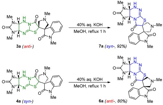Another approach to the compounds 6 and 7 is the rearrangement of isomers 3 and 4 upon treatment with KOH under reflux in methanol. Taking diastereomers 3a and 4a as examples, we found that the anti-diastereomer 3a (3aR*,4′R*,6S*,9aS*) underwent rearrangement into the isomeric syn-diastereomer 7a (3aR*,4′S*,7R*,9aS*), while the rearrangement of the syn-diastereomer 4a (3aR*,4′S*,6R*,9aS*) gave rise to the isomeric anti-diastereomer 6a (3aR*,4′R*,7S*,9aS*). The yields of the rearrangement products 6a and 7a were 80 and 92%, respectively (Scheme 5).
