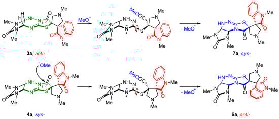 The presumable rearrangement mechanism is depicted in Scheme 6. We assume that the rearrangement occurs as transamidation reaction upon treatment with KOH in methanol []. The nucleophilic attack of the methoxide anion onto the carbon atom C(7) results in the cleavage of the C(7)–N(8) bond followed by rotation of the spiropyrrolidinyloxindole moiety around the C–S bond and the recyclization involving the nitrogen atom N(4) of the triazine ring (Scheme 6).