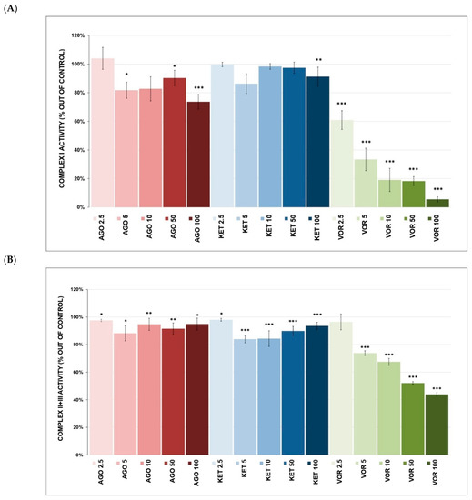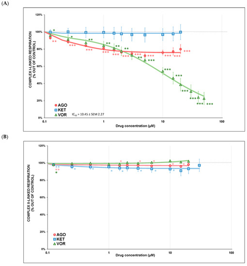 (A) Antidepressant-induced inhibition of complex I-linked respiration. Dose-response curves are displayed as plots of the respiration rate against drug concentration. Relative activity is displayed as 100% activity of control sample. Points are the mean of four independent measurements and lines represent the best/fitted curves using a four-parameter logistic function. Statistical significance was tested using a one sample t-test that mean value is equal to 100% and is expressed as * p ˂ 0.05. ** p ˂ 0.01. *** p ˂ 0.001. The half-maximal inhibitory concentration (IC50) was calculated for VOR. Drugs concentrations are expressed in μM. AGO—agomelatine, KET—ketamine, VOR—vortioxetine. (B) Antidepressant-induced inhibition of complex II-linked respiration. Dose-response curves are displayed as plots of the respiration rate against drug concentration. Relative activity is displayed as 100% activity of control sample. Points are the mean of four independent measurements and lines represent the best/fitted curves using a four-parameter logistic function. Statistical significance was tested using a one sample t-test that mean value is equal to 100% and is expressed as * p ˂ 0.05. ** p ˂ 0.01. *** p ˂ 0.001. Drugs concentrations are expressed in μM. AGO—agomelatine, KET—ketamine, VOR—vortioxetine.