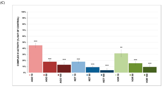 KET and AGO had almost no effect on the activity of complexes I, II+III (Figure 1A,B) and the mitochondrial respiratory rate (Figure 2A,B). However, they were very potent inhibitors of complex IV (Figure 1C). Complex IV is the rate-limiting player in OXPHOS, initiating the final step in the ETC and its activity is also coupled with neuronal activation. It was previously reported that antidepressants might have both stimulating and inhibiting properties toward complex IV activity, while other psychoactive drugs mostly tend to increase their activity [37]. The current results for KET are in accordance with our previous results as follows: KET is only a very weak inhibitor of complex I-linked respiration (Figure 2A) and shows no inhibitory activity against complex II-linked respiration (Figure 2B) [30]. Other studies describing KET-induced mitochondrial changes reported the following several inconsistent results: reversed chronic mild stress-induced inhibition of complexes I, II and IV in rats; increased complex IV activity in rats after subchronic KET administration; no significant effect on mouse brain and macrophage mitochondria [38,39,40].