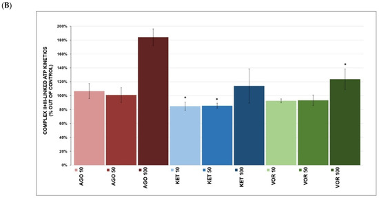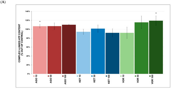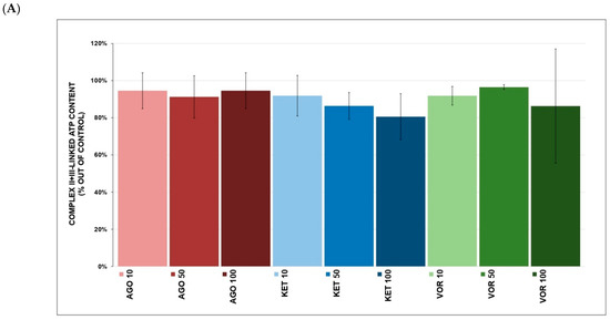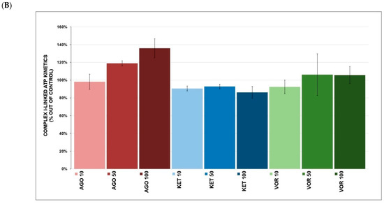 Complex I-linked ATP content (Figure 3A) was increased after VOR (119.0 ± 10.6% at 100 μM, p = 0.037, mean ± SD) and AGO (106.4 ± 4.0% at 10 μM, p = 0.044), but KET had no significant effect. Complex I-linked ATP kinetics (Figure 3B) were not affected by any tested drug. None of the tested drugs significantly affected complex II+III-linked ATP content (Figure 4A). Complex II+III-linked ATP kinetics (Figure 4B) was significantly affected by KET (84.9 ± 5.9% at 10 μM, p = 0.048) and VOR (92.6 ± 2.8% at 10 μM, p = 0.046).