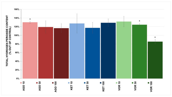 Changes in H2O2 production were observed in all tested drugs, total H2O2 content is depicted in Figure 5. The statistically significant increase in H2O2 content was caused by AGO (130.1 ± 2.7% at 10 μM, p = 0.041) and by VOR (124.5 ± 2.5% at 50 μM, p = 0.046). However, VOR at 100 μM decreased the total H2O2 content (85.4 ± 5.0%, p = 0.037). KET showed no statistically significant effect on total H2O2 production.