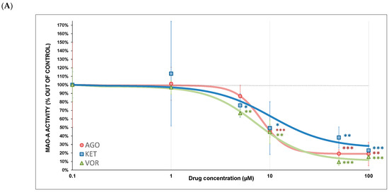 All three tested substances were found to be partial inhibitors of MAO-A (Figure 6A). The strongest MAO-A inhibitor was VOR (IC50 = 7.33 ± 1.1 µM), followed by AGO (IC50 = 8.20 ± 1.4 µM) and KET (IC50 = 10.36 ± 8.3 µM). MAO-B activity (Figure 6B) was partially inhibited by VOR (IC50 = 18.24 ± 3.5 µM); KET showed only a weak MAO-B inhibition (IC50 = 51.16 ± 25.5 µM); AGO did not affect its activity at all (kinetic parameters were not calculated). Drug-induced MAO-A and MAO-B inhibition curves are depicted in Figure 6A,B and the kinetic parameters are summarized in Table 2.